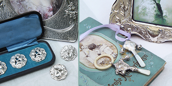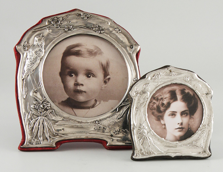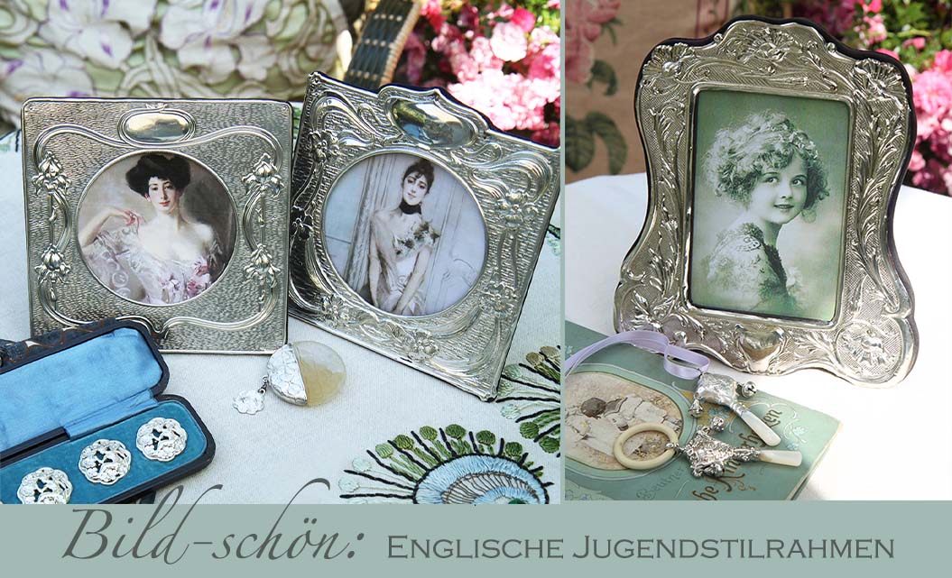 Dieses Mal habe ich Ihnen „Blumenrahmen“ mitbringen können. Typische Blumen des Jugendstils - Iris, Mohn, Buschwindröschen – die sich auf interessant gemustertem Untergrund, der im Licht wunderschöne Reflexe erzeugt, plastisch hervorheben und mit Blätterranken oder geschwungenen Bänder verbunden sind. Auch die quadratische Form mancher Rahmen ist typisch für die englischen Jugendstilrahmen, die auch oft mit einer Kartusche versehen sind, für ein Monogramm oder eine persönliche Inschrift. „Meine“ Rahmen haben freie Kartuschen, können also von Ihnen, wenn gewünscht, graviert werden: Passend zum Foto, ein Geburtsdatum, der Hochzeitstag, Ihre Initialen. Die meisten dieser englischen Rahmen, ob nun Jugendstil oder schlichter Art déco, wurden in Manufakturen in Birmingham hergestellt, die sich auf „Small Silverware“ und „Silver Curios“, Kleinsilber und persönliche Silbergegenstände spezialisiert hatten. Von Toilettenaccessoires bis zu Nähutensilien, aber auch Knöpfe, Gürtelschnallen, Handschuhspanner, Ballkartenetuis, Babyrasseln, etc. und natürlich auch prächtige Fotorahmen gehörten zu Ihrem Silbersortiment. Zu den berühmten Firmen zählten Deakin & Francis, ein Traditionsunternehmen, 1884 gegründet und bis 2001 tätig. Arthur & John Zimmerman, von 1889 bis 1940 auf feine Rahmen spezialisiert, sowie die Firmen Levi & Salaman und Adie & Lovekin, die alles was es an „small and curios“ gab, in bester