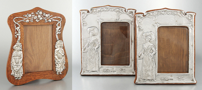 Jahr. Auch japanische Stilelemente, die prägenden Einfluss auf die Jugendstilkunst hatten, fanden über Großbritannien durch die großen Ausstellungen japanischer Kunst in London 1854 und 1862 und ein Handelsabkommen mit Japan, Zugang in die europäische Kunst. Ein schönes Beispiel für diesen japanischen Einfluss auf den englischen Modern Style sehen Sie bei den beiden Rahmen – klein und groß – von der ebenfalls auf Rahmen spezialisierten Silberfirma J. Atkin & Son aus den Jahren 1905 und 1906.