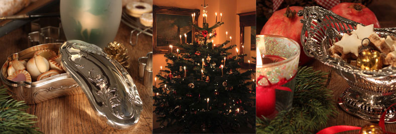 Es gibt viele Möglichkeiten Kulinarisches und mehr, sei es nun selbstgemacht oder liebevoll ausgesucht, mit Silber zu einem unvergesslichen Geschenk zu kombinieren. Die Marmelade zu dem seltenen Marmeladenglas mit Silbermontierung aus unserer Rubrik“ Weihnachtsgeschenke“, der Weihnachtslikör in einer edlen Karaffe, der Champagner im Silber- Sektkühler. Oder wie wäre es mit einem selbstverfassten Gedicht oder einem Versprechen, „verpackt“ in der russischen Herzdose aus Filigransilber oder dem Reisegutschein im Silberrahmen für das spätere Erinnerungsfoto. Vielleicht stöbern Sie unter diesem Gesichtspunkt einmal durch die Silbersuite und finden Ihr ganz besonderes, persönliches Geschenk. Wir wünschen Ihnen dazu viel Vergnügen und allen die jetzt mal wieder Lust aufs Selberbacken bekommen haben, sei versichert: Es gibt nichts Schöneres als der Duft nach Zimt, Anis und gemahlenen Mandeln der durchs Haus zieht, der Stolz, das Gelungene Schicht für Schicht in Dosen – oder Silber zu packen und die Komplimente von Familie und Freunden. Und nicht zuletzt –nichts schmeckt so gut, wie das aus der eigenen Backstube! In diesem Sinne wünschen wir Ihnen eine besinnliche und kreative Adventszeit.