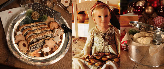 Die meiste und schönste Zeit jedoch verbringe ich in der Küche. Jetzt werden Stollen und Plätzchen gebacken, Früchte kandiert, Pralinen geformt und die letzten Gläser Marmelade – es ist die Orangenmarmelade - eingekocht. All das versüßt nicht nur uns selbst die adventlichen Tage. Diese selbstgemachten Leckereien sind auch ganz wunderbare Geschenke, die immer wieder große Begeisterung finden, vor allem, wenn sie schön und kostbar in Silber „verpackt“ einhergehen. Teller, Schalen, Körbe, Gläser, Dosen – das Silber bleibt, auch wenn der Inhalt nach Weihnachten längst gegessen ist. Der perfekt erhaltene Teller aus Lyon um 1800, hier mit köstlichem, schlesischen Mohnstollen ( ein Rezept von meiner Mutter), veredelt jede Advents–Tee/Kaffeetafel, ist aber auch an jedem anderen Tag des Jahres ein außergewöhnliches Stück , das überall und auch ohne Inhalt dekorative Verwendung findet, genauso wie die reich verzierte Tazza, die rund ein Jahrhundert später in den USA gefertigt wurde. Wunderbar eignen sich auch edle Glasdosen mit Silbermontierungen oder Silveroverlay, die sich genauso gut auf dem Teetisch mit Keksen oder Ingwer machen, wie auf dem Toilettentisch mit Wattebausch und Duftessenz. Lisa, die kleine Tochter der Nachbarin ist vorbeigekommen und hilft beim Plätzchen ausstechen und Schüssel auslecken. Ihr hat es das kleine Alt Wiener Körbchen von 1818 besonders angetan- oder ist es eventuell nur das Marzipankonfekt? Die große, schlichte Londoner Keksdose von 1863 ist ein Geschenk für jemanden ganz besonderen oder auch mal für sich selbst! Für die Romantischen ist der aufwändig gestaltete Victorianische Korb aus London, ein sogenannter Dessert Dish, genau das Richtige, oder die originelle, zweigeteilte Keksschale aus Wien des Jahres 1856.