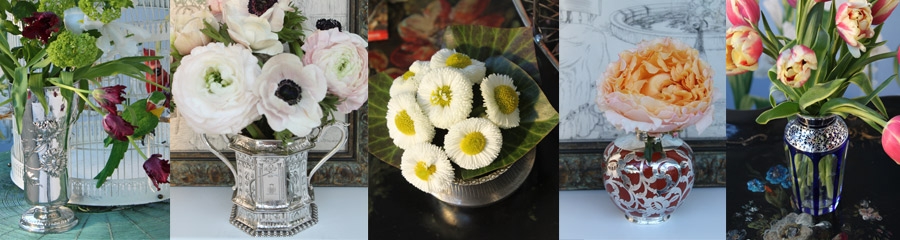 Wie viele schöne Möglichkeiten es gibt, Blumen mit Silber wunderbar in Szene zu setzten, sehen Sie im unteren Bild, alle Vasen und Gefäße finden Sie auch im Warenangebot, der Biedermeierkorb ist das Angebot des Monats April. Aber auch sonst waren Silberobjekte mit Blumen verziert zu allen Zeiten eine Erfolgsgeschichte. In verschiedensten Stilen und Techniken zieren sie nicht nur Vasen, Körbe und Schalen, sondern „blühen“ - gerne auch in Begleitung von verspielen Putten – auf Kannen, Bechern, Leuchtern, Gewürzgefäßen und vielem mehr.