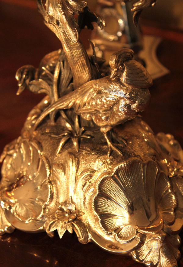 Spätestens aber bis Mitte Januar holen wir das Versäumte nach und laden Freunde zum Neujahrsempfang um jetzt gemeinsam mit ihnen das neue Jahr willkommen zu heißen- mit besten Vorsätzen, neuen Plänen und viel schönem Silber. Das Neujahrsbüffet mit Lachstartar bis Rollmops ist diesmal nordisch zünftig, die Champagner-Bar auf dem Sideboard edel und luxuriös. Der Champagner bekommt in der großen Art Deco Silberschale eine stilvolle Kühlung. Drei bis vier Flaschen und jede Menge Eis passen in so eine „Silberwanne“, die aber auch im „Alltag“ als noble Obstschale oder elegante Jardiniere auf jedem großen Tisch ein absoluter Eyecatcher ist. Das gilt ebenso für das hohe Paar Girandolen aus Leipzig um 1800, das mit jeweils vier Kerzen für stimmungsvolles Ambiente sorgt. Aus Frankfurt um 1840 stammt der prächtige Tafelaufsatz, in dessen schön geschliffener Kristallschale exotische Früchte als Zierde und zum Dessert arrangiert sind. Der Tafelaufsatz im Louis Philippe Stil, aus dem Hause Hessenberg, eine der führenden Silberschmieden Frankfurts im 19. Jahrhundert, ist höchst aufwändig mit Attributen von Wasser und Land gestaltet: Ente und Fasan, Muscheln und Blumen, Schilf und Lilienblüten. Vielleicht ist Ihnen aufgefallen, wie unbekümmert wir, hier und auch schon in vorherigen Kalenderbildern, das Silber verschiedener Stile und Epochen – hier sind es Art Deco, Empire und 2. Rokoko - miteinander in und zu einem Bild mischen. Mit ein wenig Geschick können Sie (fast) alles kombinieren.