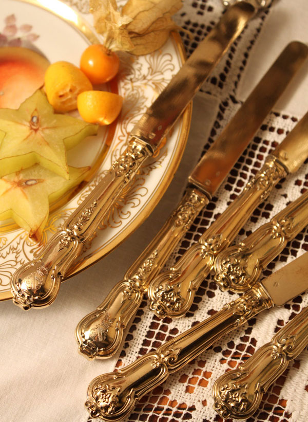 Zurück zum Neujahrsempfang, bei dem die Gäste beim Dessert angekommen sind. Kiwano, Litschi Sternfrucht, Pitahaya und die in filigrane Blätter gehüllten Physalis sind nicht nur dekorative Exoten, ihr feines und interessant schmeckendes Fruchtfleisch ersetzt jetzt gerne die süßen Kaloriensünden der Weihnachtszeit. Als Obstmesser haben wir vergoldete Silbermesser aus Paris um 1870 gedeckt, die jetzt im Januar auch das Angebot des Monats sind.