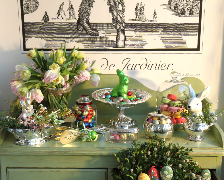 Ostern war nach Weihnachten ganz sicher das Lieblingsfest meiner Kindertage. Am Ostersonntag weckte uns unsere Großmutter mit einem Apfel, den wir, ohne vorher ein Wort sprechen zu dürfen, aßen – ein alter Osterbrauch aus Großmutters Heimat, der langes Leben und ewige Schönheit bringen sollte. Dann aber ging´s mit Juche aus dem Bett, um in Haus und Garten zu suchen, was der Osterhase gebracht hatte. Nun, die vielen Leckereien, bunten Eier und kleinen Geschenke hatte natürlich meine Mutter versteckt, teilweise so raffiniert, dass noch im Sommer per Zufall das eine oder andere zum Vorschein kam. Zum Osterbrunch war der Tisch festlich mit viel Silber und noch mehr bunten Tulpen gedeckt, es kamen Verwandte und Freunde und es wurde bis zum späten Nachmittag gegessen, geredet und gelacht. Am Abend hatten alle Kinder Bauchweh von zu viel Schokolade und Zuckerzeug, waren aber trotzdem rundum glücklich. Auch heute noch freue ich mich ganz besonders auf Ostern. Ich esse noch immer morgens schweigend meinen Apfel, decke für Familie und Freunde den Tisch mit viel „Farbe" und Silber für den Osterbrunch und – will auf alle Fälle ein „Osterei" suchen. Was für eine Freude wenn der Osterhase anstatt Süßem, Silber versteckt hat. (Geht natürlich auch in Kombination) Wir haben in der Gartenloggia, in der wir wettersicher - halb draußen, halb drinnen - unseren Osterbrunch-Tisch für unsere Gäste decken, auf der alten Kommode ein paar glänzende Ideen für den Osterhasen zusammengestellt: Als Centerpiece im wahrsten Sinne des Wortes, steht die prächtig verzierte Fußschale aus Wien um 1870, die kunterbunten und sehr leckeren Maccarones werden in der runden Art Deco Schale aufgeschichtet, eine feine Handarbeit aus dem Haus Carl Weißhaupt, der berühmten Silberdynastie aus München. Hier besonders dekorativ mit einer Glashaube vor kleinen, allzu vernaschten Kinderhänden geschützt. Davor sitzt vergnügt ein Osterhase in der Sahnekanne aus Stuttgart um 1830, daneben prall gefüllt eine polnische Deckeldose aus Warschau der Dreißiger Jahre und die Kristalldose mit schwerem Silberdeckel aus Wien um 1920. Fast wie ein Osterei selbst wirkt die mit Schokoladeneiern farbig bestückte