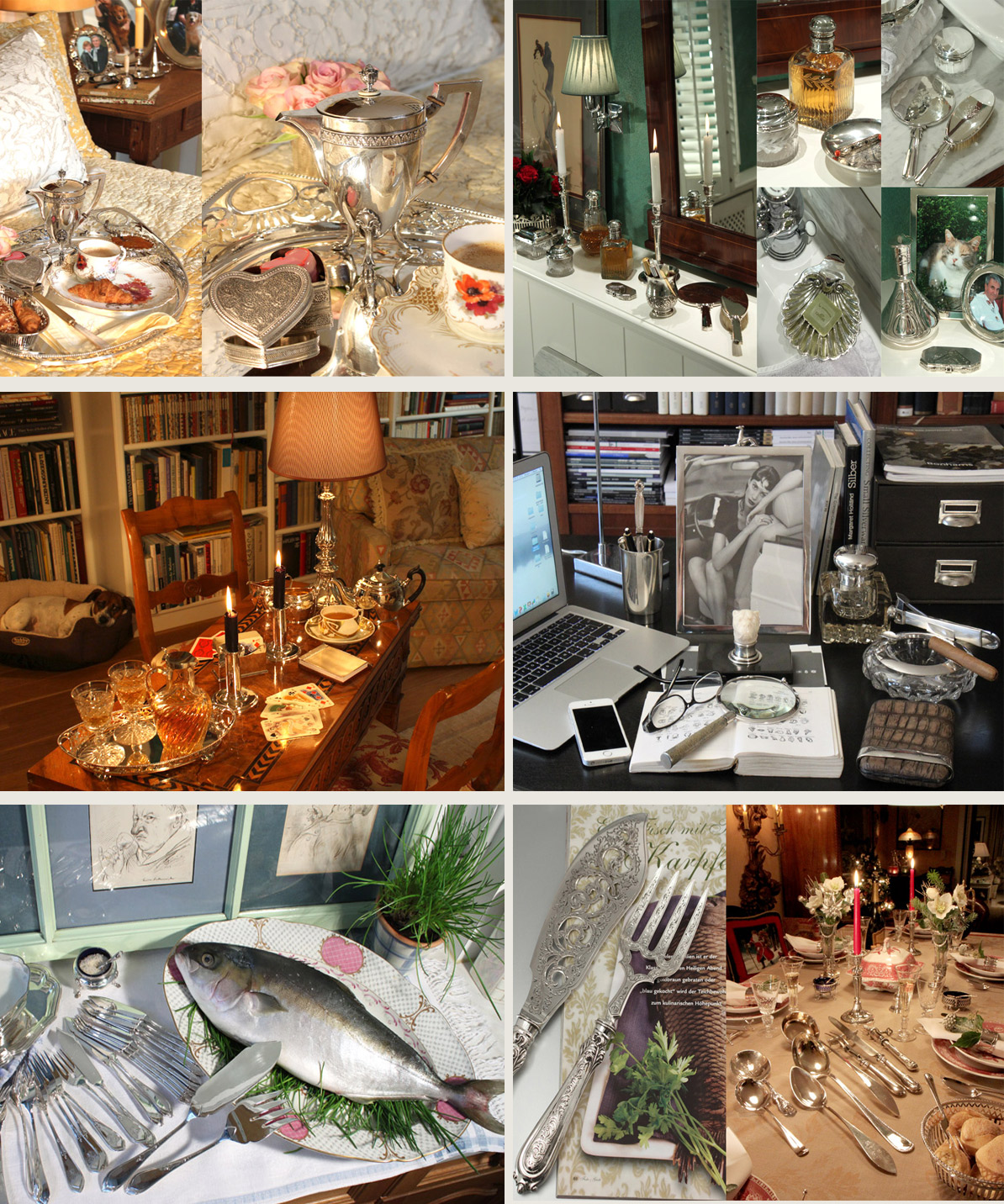 Ja, sie machen mir Freude, diese Silberartikel, aber auch viel Mühe. Sie kosten Zeit, Arbeit, viel Vorbereitung und manchmal auch Einiges an Geld. Mein Blumenhändler strahlt, wenn ich wieder mit einem Silberobjekt in der Hand in den Laden komme. Auch die Verkäufer im Feinkostladen in München kennen mich mittlerweile und suchen mir besonders schöne Exemplare der Leckereien heraus- „gell, ist´s wieder fürs Foto“. Manche Magazine sind unkompliziert, für andere, vor allem die, mit großformatigen Fotos, muss ich mindestens eine Woche veranschlagen. Nehmen wir zum Beispiel den Artikel „Große Tafel – Silber für Genießer“ . Einige Themen hatte ich schon immer auf der Wunschliste, wie „Liebling Hund – Silber mit Wau-Effekt“ oder „Glücklich mit Pferd und Silber“. Für diese Geschichten sammle und horte ich die selten zu findenden Objekte, bis es für Foto und Artikel reicht. Das kann schon mal 2 Jahre dauern.