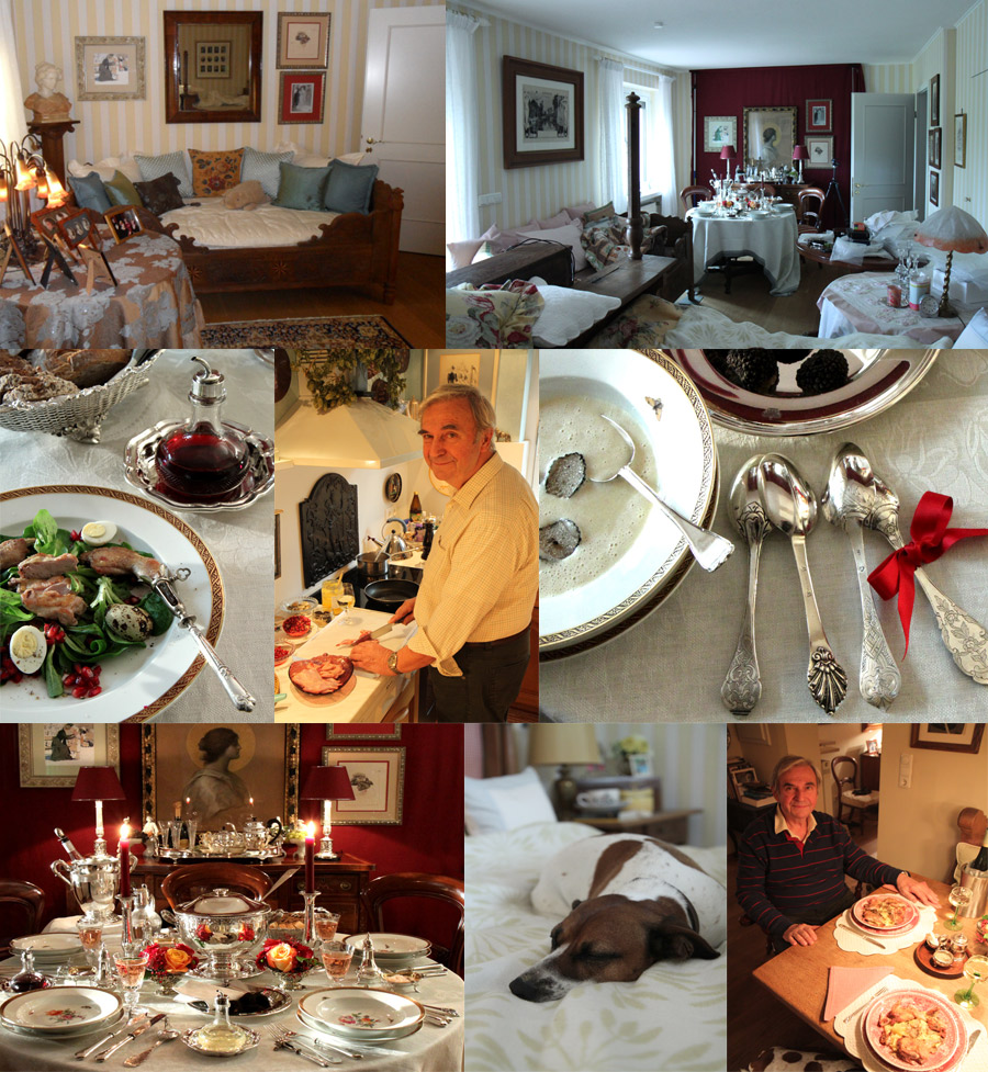 Für die "Große Tafel" war es umgekehrt. Hier habe ich mich durch das Silber, die neuen Objekte, inspirieren lassen. Ich bekam gerade eine große Deckelterrine, ideal als Mittelpunkt, hatte zwei tolle Leuchter, ein imposantes Galerietablett, verschiedene Barocklöffel aus Augsburg, und anderes interessantes Tafelsilber. Alles, was sich für einen festlich gedeckten Tisch eignet. Wie es aussieht, wird es ein komplizierter Aufbau. Für ein großes Querbild fehlt der geeignete Hintergrund im Haus. Die einen Wände sind nicht lang genug, werden durch Türen oder Heizkörper unterbrochen, die anderen sind mit einer nicht passenden Tapete bezogen, im Esszimmer, in dem meine eigenen großen Tafeln stattfinden, hängen Deckenlampe und die vielen Bilder im Weg, in anderen Räume ist zu wenig Abstand zwischen Tisch und Kamera. Wohin? Im Schlafzimmer mit gelb-weißer Streifentapete wäre Platz und eine lange Wand. Während ich das Silber auf Hochglanz bringe, fährt mein Mann 80 Kilometer zum Messeausstatter und kauft 6 Meter Molton in Bordeaux, mit dem wir die Wand bespannen. Vorher müssen die Bilder, der schwere Spiegel abgehängt, die Möbel zur Seite geschafft werden. Das Sideboard aus dem Wohnzimmer, der Tisch und die Stühle aus dem Esszimmer werden ins Schlafzimmer geschleppt. Schön, wenn man hier vier Hände hat. Lebensmittel werden, gemäß dem Menüplan eingekauft, die Ware dekoriert, das Licht aufgebaut, die Gerichte für die Fotos – Feldsalat mit Wachteln, Topinambur-Suppe mit Trüffel und der Nachtisch, frisch zubereitet. Jack Russel Barnie ist beleidigt, weil sein Körbchen nicht mehr an seinem Platz steht und nimmt alternativ unser Bett in Anspruch. Mit den Fotos bin ich zufrieden und als „Lohn“ wartet an diesem Abend ein Menü aus getrüffeltem Sahnesüppchen, gebratenen Wachteln und Pfirsichtörtchen auf uns. Aufgeräumt wird morgen.