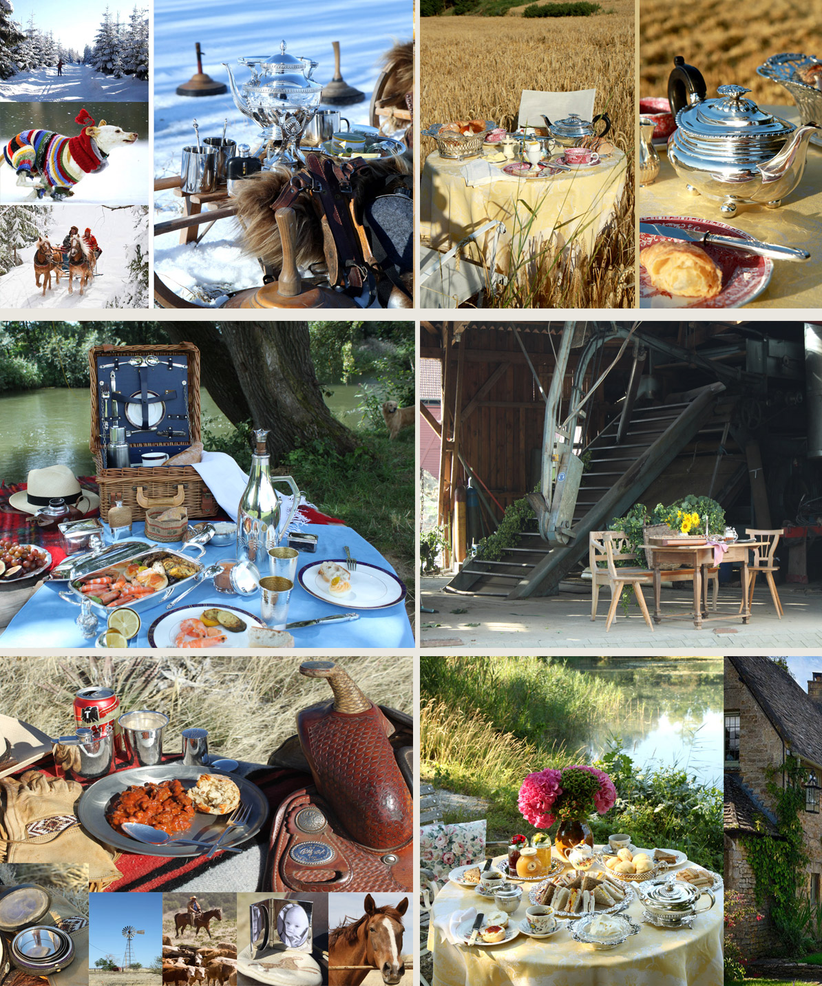 Natürlich erleichtert mir das Fotografieren in und um das Haus die Arbeit, alles ist griffbereit in der Nähe und umständliches Packen und langes Fahren entfällt. Aber nicht alle Ideen ließen/lassen sich im heimischen Umfeld realisieren und so brachte ich das Silber, mit allem was dazugehörte, dahin, wo es hin musste: Zum nahen Dorfweiher "Winterfreuden", und aufs Feld "Frühstück im Kornfeld", in Nachbar´s Hopfenhalle, zum Picknicken an den Fluss "Landpartie" , bis nach England "Teatime" und sogar nach Arizona, USA " Silber goes Wild West".