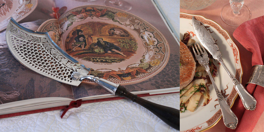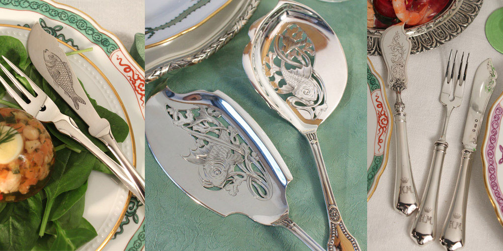 So variantenreich die Rezepte für Fisch & Co. sind, so vielseitig waren auch die Silberschmiede und Entwerfer ihrer Zeit in der Gestaltung des Silbers für die dazugehörigen Bestecke: Gesägt, ziseliert, graviert, als Fisch geformt, aufwändige Durchbrucharbeiten und immer wieder Wasserpflanzen und Meeresgetier als fantasievolle Zier – wie unsere Beispiele hier aus Frankreich, Belgien, Italien, Holland, Österreich und Deutschland schön zeigen.