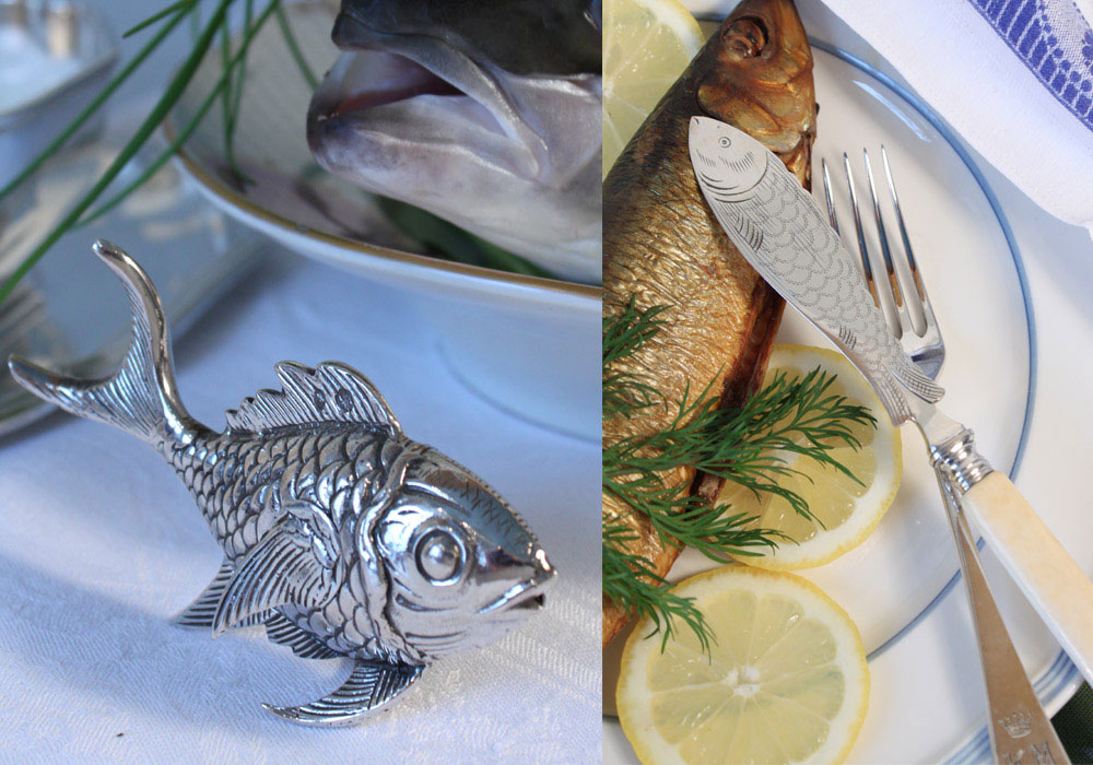 Mehr Fisch! So lautet ein Slogan der „Deutschen See“ und ihrer Fischhändler. Mehr Fisch ist auch die Empfehlung der „Deutschen Gesellschaft für Ernährung“, denn Fisch ist eines der wertvollsten Lebensmittel, die wir haben. Leicht, „schlank“ und reich an Eiweiß, Vitaminen und wertvollen Fettsäuren. Das bei uns zu Hause zwei bis dreimal die Woche Fisch und Meeresfrüchte auf der Speisenkarte stehen, ist allerdings weniger eine Frage der Gesundheit. Nichts ist so vielfältig – mir fallen auf Anhieb 30 Arten - von Hering bis Hummer - ein, die schon auf unserem Menüplan standen, nichts so variantenreich in der Zubereitung wie diese gesunden Köstlichkeiten aus Meer, Fluss und See. Kurz gesagt - wir lieben Fisch! Zu so viel Fisch auf dem Tisch gehört (für den Silberfan sowieso) selbstverständlich auch das passende Silber: Fisch- und Kaviarbestecke, Austern- und Hummergabeln, Krebsmesser und Sardinenheber, Fischvorlegebestecke- und Heber. Wir haben alles, wenn wundert´s, in persönlichem Gebrauch und in vielen schönen Ausführungen und Varianten für Sie im Warenangebot der Silbersuite. Fisch & Co. ist auch unsere bevorzugte Wahl wenn Gäste kommen. Als Vorspeise – kleine Fischpasteten, Lachstatar und in der kalten Jahreszeit auch mal Austern - oder als Hauptgericht. Dann gerne als „großer Ganzer“, was nicht nur köstlich schmeckt, sondern auch fürs (Gäste-) Auge viel her macht.