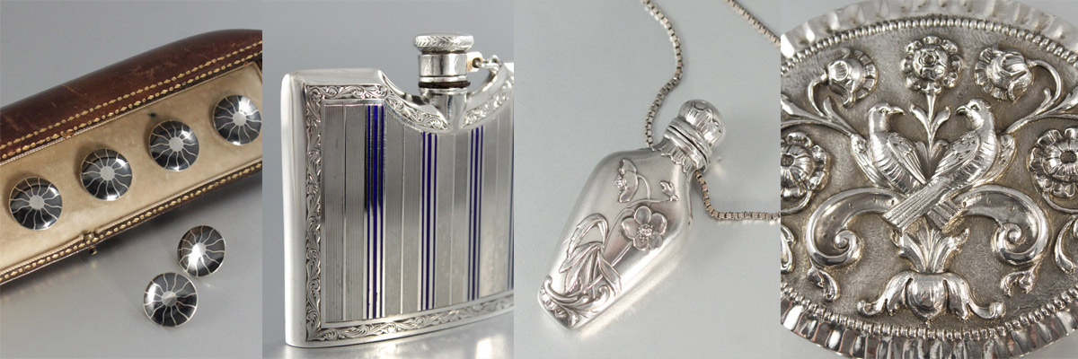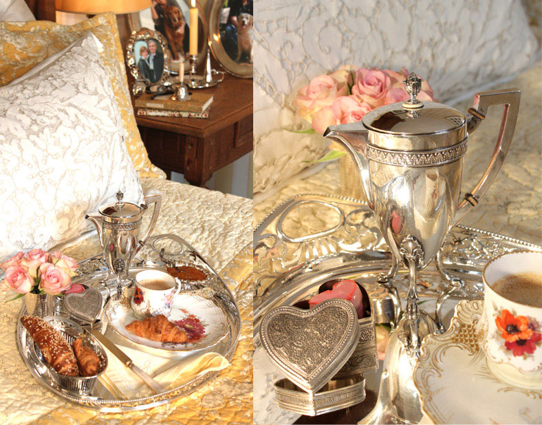 Hand aufs Herz, wann haben Sie das letzte Mal ihrer/ihrem Liebsten das Frühstück ans Bett gebracht. Am Hochzeitstag, am Muttertag, am Geburtstag - oder letzten Sonntag? Sie können sich nicht erinnern - dann wird es Zeit, es mal wieder zu tun. Denn, gibt es etwas Romantischeres als morgens mit einem zärtlichen Guten-Morgen-Kuss, Kaffeeduft und warmen Croissants geweckt zu werden. Herztablett Besonders schön, wenn das „petit déjeuner“ auf einem silbernen Tablett serviert wird. Ideal dafür ist das große niederländische Tablett von 1914 mit reich verzierter Galerie und hochgezogenen Handhaben. In die kleine Kanne aus Wien um 1890 im Empirestil gehen 2-3 Tassen Tee oder Kaffee, gleich so zubereitet ( für mich Nespresso mit Sahne und Honig) wie sie/er es liebt, im zierlichen Körbchen, ebenfalls eine Wiener Arbeit, hier um 1840 liegen die herrlich duftenden Minibrötchen und die leckeren Croissants, für Konfitüre und Butter sind kleine Gewürzschälchen mit Innenvergoldung ideal. Als Geschirr ist ein sogenanntes „petit déjeuner“, ein Teller auf dem die Tasse gleich rutschfest und platzsparend integriert ist, bestens geeignet Diese gibt es neu und ganz modern oder wie hier von der Nymphenburger Porzellanmanufaktur aus dem 19. Jahrhundert (auf Anfrage auch verkäuflich). So ist noch genügend Platz für ein Sträußchen Lieblingsblumen und - vielleicht aus gegebenen Anlass oder auch nur einfach so! - ein kleines Silbergeschenk. Wie heißt es so treffend: „Kleine Geschenke erhalten die Freundschaft, etwas größere die Liebe“. Männer wissen das, kluge Frauen auch! Wir haben hier und in „Neu eingestellt“ ein paar „Kleinigkeiten“ zur Auswahl zusammengestellt: Den kleinen Silber-Email-Flachmann aus der Art Deco Zeit, die Silberknöpfe mit schwarzem Niello, oder das große Tintenfass im Stil der Wiener Werkstätte. Die Dame des Herzens freut sich vielleicht über eine ungewöhnliche Keksdose, einen verspielten Rahmen oder Spiegel, ein Parfümflakon als duftenden Halsschmuck oder die wunderschöne Hochzeitsdose mit den Turteltäubchen. Richtig romantisch wird es mit den  „Silberherzen “: Zum Beispiel der russische Filigrandose als kostbare „Schachtel“ für herzige Süßigkeiten oder einen längst überfälligen Liebesbrief? Die Herzkette ist ein seltenes Designerstück von Astrid Fogg für das Haus Georg Jensen aus dem  Jahr 1970 und welche Frau kann schon nein sagen, wenn die Frage der Fragen auf diesem ausgefallenen Herztablett „serviert“ wird ! Für alle neu , noch und wieder Verliebten ist es diesmal das Angebot des Monats, über das sich übrigens auch die Mütter freuen.(Am 12. Mai ist Muttertag!) Wir haben Mai, endlich ist es Frühling, mal wieder Zeit für ein wenig Romantik und die beste Gelegenheit für ein Ich-liebe-Dich-Geschenk“.