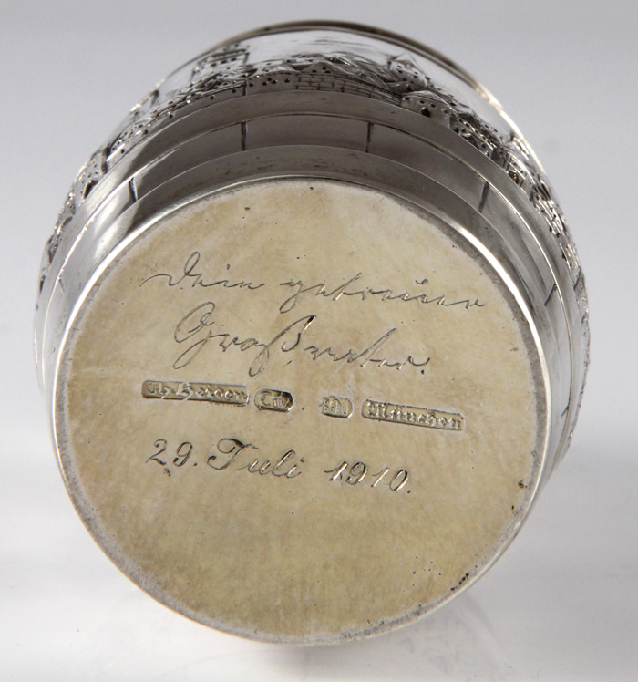 Der Becher aus München 1910: Lotte war 15 Jahre als ihr Großvater sie das erste Mal mit nach München nahm. Es war Liebe auf den ersten Blick. Besonders die unzähligen Kirchen in ihrer Pracht und den großen imposanten Türmen hatten es Lotte angetan, die von ihrem norddeutschen Heimatstädtchen nur eher schmucklose Gotteshäuser kannte. Was für eine bunte, lebenslustige Stadt. Wann immer der Großvater zu Geschäften nach München aufbrach, bat und bettelte Lotte ihn, sie wieder mitzunehmen. Da dies meist nicht möglich war, gab es viel Enttäuschung und manche Tränen, bis der Großvater ihr von einer München-Reise zurückkehrend diesen kleinen Fassbecher mit den Worten mitbrachte. „Jetzt hast Du Dein München immer vor Augen ". In der Tat, dieser kleine Silberbecher zeigt rundum in schöner Reliefarbeit das ganze Münchner Stadtpanorama. Er ist eine Arbeit der bekannten Königlich Bayrischen Holfgoldschmiede Theodor Heiden, die bis heute, jetzt in der fünften Generation, zu den renommiertesten Goldschmieden Münchens gehört. Lotte gab den geliebten Becher als Hochzeitsgeschenk an Ihre Tochter weiter, die das verwirklichte, was Lotte nicht möglich gewesen war. Sie studierte Kunstgeschichte, heiratete einen „waschechten Bayern und lebte in München.
