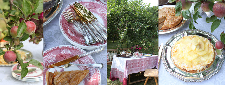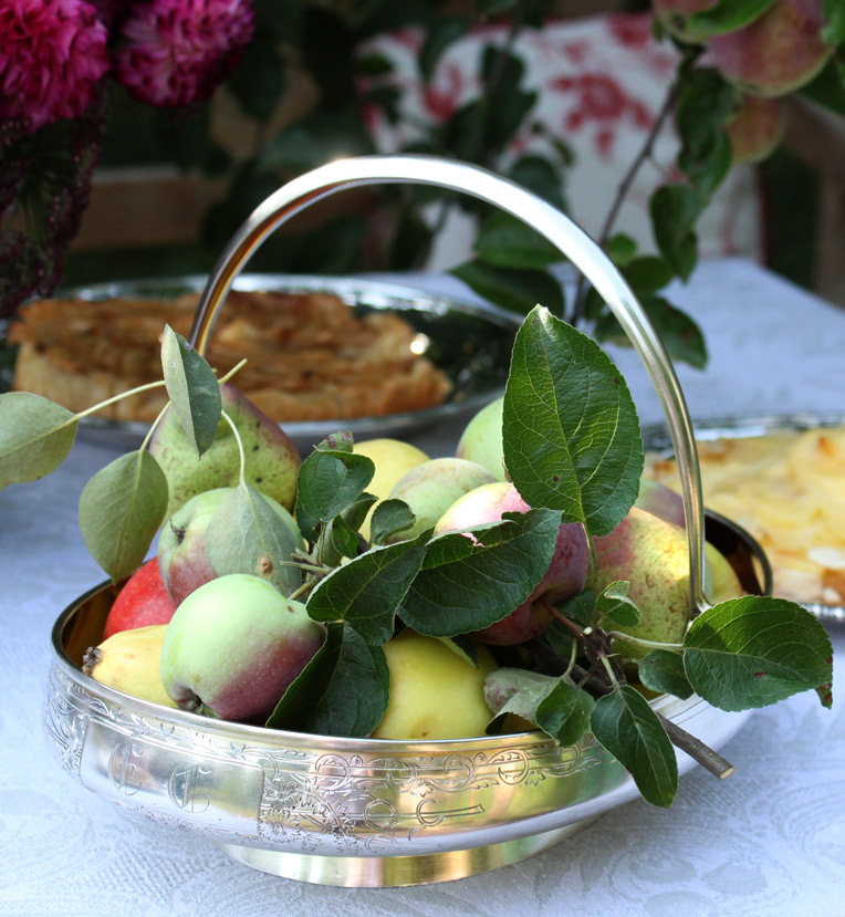 Die tiefer stehende Sonne verkündet, die heißen Tage sind vorbei. Jetzt beginnt der Altweibersommer mit seinem warmen Licht und den satten Farben in Natur und Garten. Unsere Apfelbäume tragen schwere Last und auch die ersten Birnen, späten Pflaumen und die Brombeeren sind jetzt reif zum Ernten. Wir laden zur Teestunde unterm Apfelbaum. Die noch warmen, herrlich duftenden Apfel-Tartes (aus eigener Ernte) werden auf runden Silberplatten serviert. Die glatte Platte kommt aus Lyon um 1800 , die geschwungene Platte mit dem verzierten Rand im Stil des 18. Jahrhunderts entstand rund 100 Jahre später in Deutschland. Der kurze Kuchenheber hat eine besonders schön verzierte Laffe und einen interessanten Griff aus orangefarbenem Achat. Er wurde von der renommierten niederländischen Firma van Kempen 1882 hergestellt. Das dekorative, dreiteilige Teeservice stammt aus Wien. Die große Kanne mit den geschwungenen Zügen fasst zwei Liter, also gut 8 bis 10 Tassen Tee und ist, genau so wie Milchkännchen und Zuckerdose innen vergoldet. Der große Jugendstil-Streuer mit seinem plastisch herausgearbeiteten Früchtedekor und dem originalen blauen Glaseinsatz ist mit Puderzucker, den wir für die Apfelkuchen mit ein wenig Zimt gemischt haben, gefüllt. Dafür wurde er damals - in München um 1910 – gemacht und auch verwendet. In Weimar zur gleichen Zeit entstand das kleine Schälchen, das ebenfalls Herbstfrüchte ziert. Aus den Anfängen des Jugendstils 1894 stammt der prachtvolle Moskauer Henkelkorb, den wir mit frisch gepflückten Äpfeln und Birnen geschmückt haben. Er hat diesen, für russisches Silber ganz typischen, mattierten, fast golden schimmernden Silberglanz, aufwändige Blütengravierungen und eine perfekt erhaltene Innenvergoldung. Ein wirklich außergewöhnliches Stück! Da die Tartes ganz frisch und noch warm sind decken wir dazu ein Kuchen-Dessertbesteck, zierliche Silbergabeln - und messer mit vergoldetet Zinken und Klingen. Das Besteck der Düsseldorfer Besteckmanufaktur Bahner von 1890 wird als Zwölfersatz angeboten.