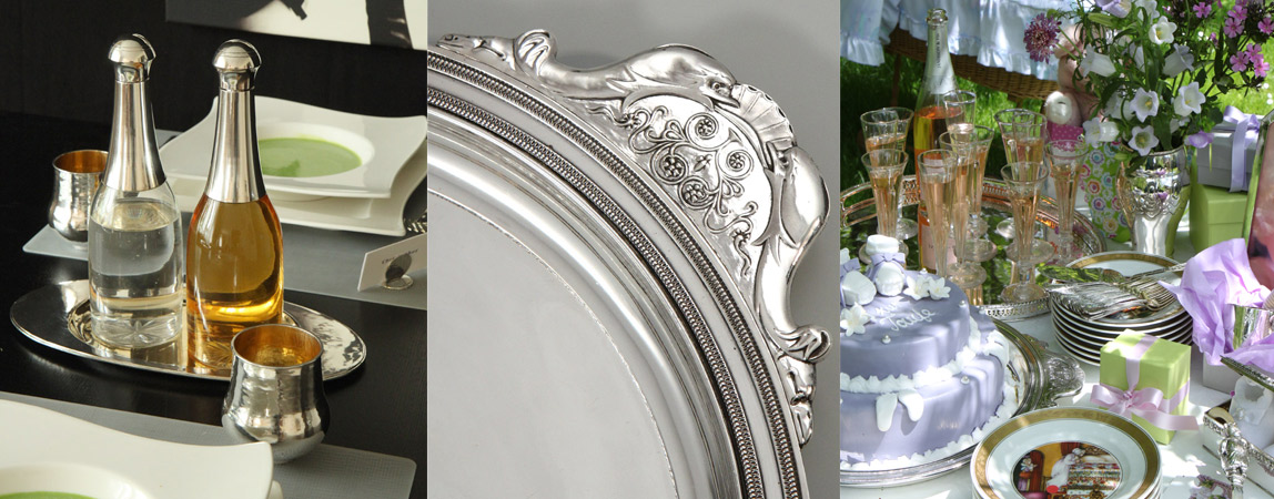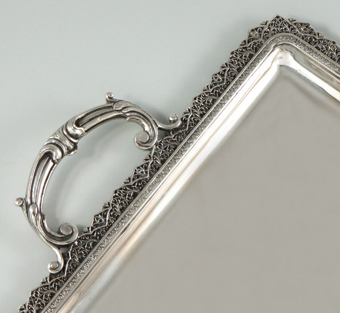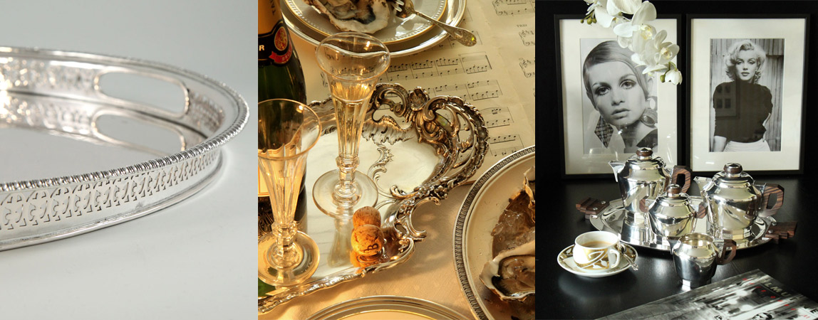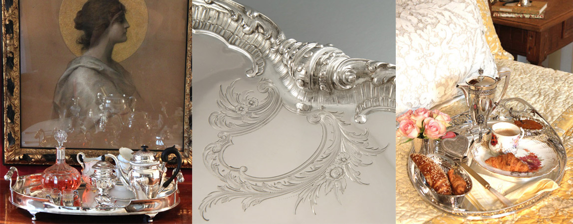 Soll ich es Dir/Ihnen vielleicht auf dem Silbertablett servieren? Solch provokanten Worten, erwiderte ich schon als junge Frau: Oh ja, das wäre mir sehr recht! Heute ist das keine Frage mehr, sondern schöne Selbstverständlichkeit. Meine „Dinge" werden auf dem Silbertablett serviert und präsentiert. So habe ich mittlerweile sieben, recht unterschiedlich in Größe und Stil, von diesen edlen und hilfreichen Stücken in Gebrauch. Obwohl ein Silbertablett meist zu den etwas größeren Investitionen zählt, finde ich doch, dass jeder Silberliebhaber mindestens zwei Silbertabletts braucht und haben sollte: Eines zum Servieren und eines zum Präsentieren. Sie haben die (Aus-)Wahl zwischen rechteckig, quadratisch, rund oder oval, kleiner oder größer. Wenn ein Tablett zum Tragen und Auftragen von Geschirr, Gläsern, Kannen und Flaschen dient, sollte es am besten feste Griffe oder Handhaben besitzen, stabil und natürlich qualitätsvoll, aber nicht zu schwer sein, denn es muss ja von Ihnen (meist die Dame des Hauses) noch zu tragen sein. Ob Sie nun die Aperitifs, die große Suppenterrine oder den Nachtisch auftragen, auf Silber sieht es einfach beeindruckend aus und begeistert mit Sicherheit auch Ihre Gäste. Oder bringen Sie Ihrer/Ihrem Liebsten mal wieder das Frühstück ans Bett. Dafür eignen sich alle Tabletts, die tiefer gemuldet sind oder einen Rand, zum Beispiel einen Gitterrand haben, so wie unser Venezianisches Tablett von 1812/30 oder das runde Tablett mit den aufwändig gestalteten „Delphin-Griffen" aus Paris um 1840, auf unserem unteren Bild zu sehen und im Warenangebot unter „Tabletts" zu finden. Das große rechteckige Tablett, links oben im Bild, stammt aus München um 1890 von dem bekannten Silberschmied Eduard Wollenweber, der auch den Titel eines „Königlichen Hofsilberarbeiters" trug und der bevorzugte Gold-Silberschmied von König Ludwig II war. Die Gestaltung der Randeinfassung des ansonsten schlichten Tablettes mutet nicht zufällig orientalisch an. Eduard Wollenweber arbeitete nicht nur im klassischen, europäischen Stil, sondern ließ sich durch die Ideen und Einflüsse fremder Kulturen, die sich in der Zeit des ausgehenden 19. Jahrhunderts durch die großen Weltausstellungen verbreiteten, zu außergewöhnlichen Arbeiten inspirieren. Auch die ausgefallene Teekanne mit dem Griff aus Mahagoniholz wurde von ihm mit orientalischen Anklängen in den Verzierungen gefertigt. Von der Größe der Stellfläche, des Spiegels, eignet sich das reich verzierte, ovale Tablett mit den Handhaben (unten im Bild) ganz wunderbar als Serviertablett . Bei uns aber hat es hier einen festen Platz auf der Anrichte bekommen und präsentiert die kleine, gepflegte Hausbar von Sherry, Portwein & Co. in edlen Karaffen mit Silbermontierungen. Auch das Wollenweber-Tablett steht hier auf einem Beistelltisch, mit Teekanne, Milchkännchen und zwei antiken Teetassen bestückt, als dauerhafter Blickfang. So ein „Teetablett" können Sie als sogenanntes Kernstück, komplett aus einem Guss haben ( siehe das Art Déco Teeservice mit Tablett von Ernst Menner bei Tee,Kaffee und Co.) oder so wie hier, ganz individuell zusammenstellen, zum Beispiel mit Ihrer vorhandenen Teekanne.