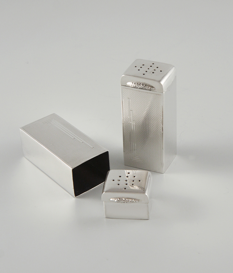 Senftöpfe Länge 6 cm, Breite und Höhe 3,5 cm, Streuer Höhe 6,5 cm,