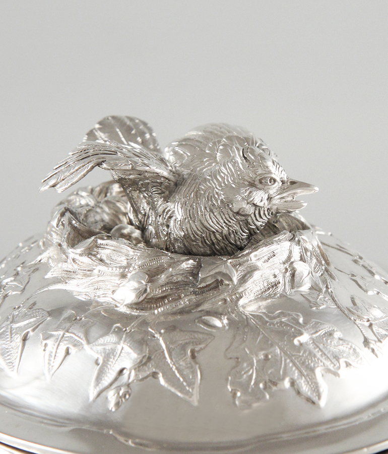 Mit brütender Wachtel als Deckelbekrönung, Weinblätterranken,