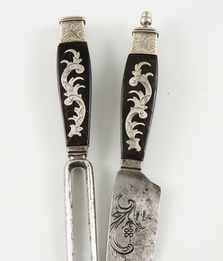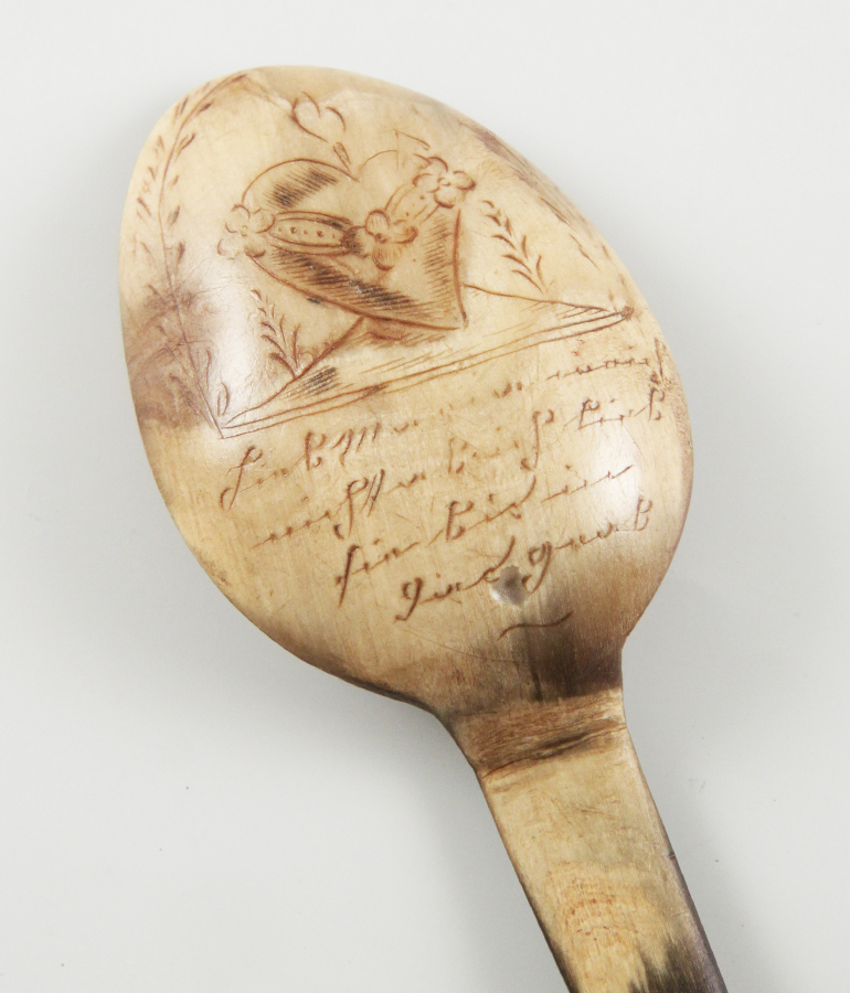 Messer mit gravierter Stahlklinge, Gabel, Hornlöffel mit beschrifteter