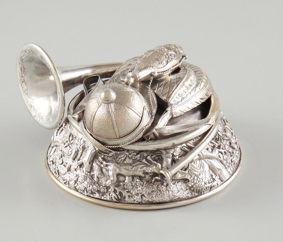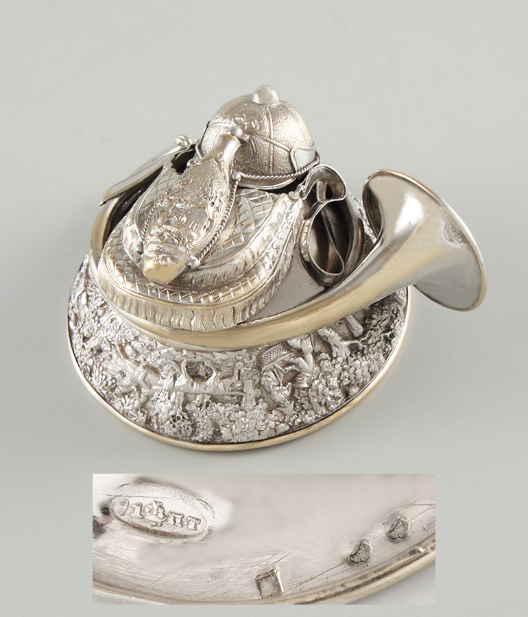 verziert mit plastischem Jagdhorn, Reiterkappe, Satteltasche