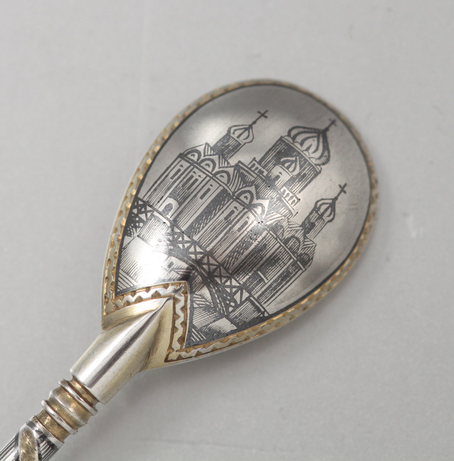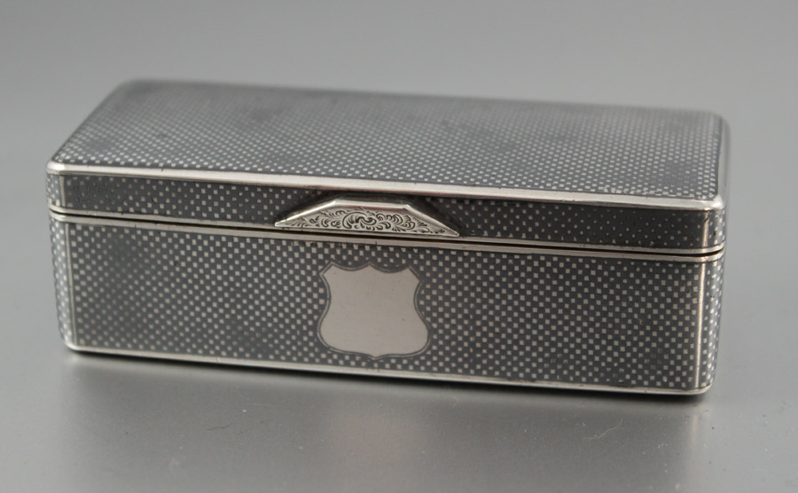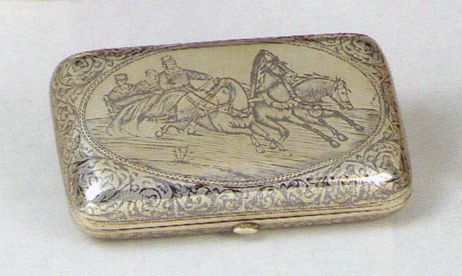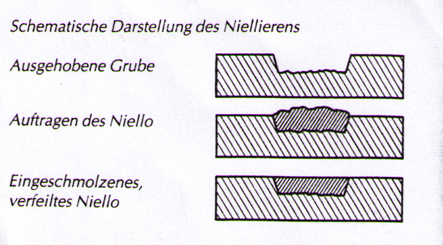 Viele russische Silberobjekte sind in Niellotechnik gearbeitet. Der Name Niello ist von dem lateinischen Begriff „nigellus“, schwarz abgeleitet. Das Niello besteht aus einer geschmolzenen Mixtur aus Silber, Kupfer, Blei und Schwefel in unterschiedlichen Anteilen. In den Silbergegenstand, der mit Niello verziert werden soll, werden erst die entsprechenden Muster graviert und dann in diese Vertiefungen die geschmolzene Niellomasse eingestrichen. Durch Erhitzen des Gegenstandes verbindet sich das Niello fest mit dem Untergrund. Nach dem Erkalten wird die Fläche geschliffen und poliert, so dass eine glatte Oberfläche entsteht.