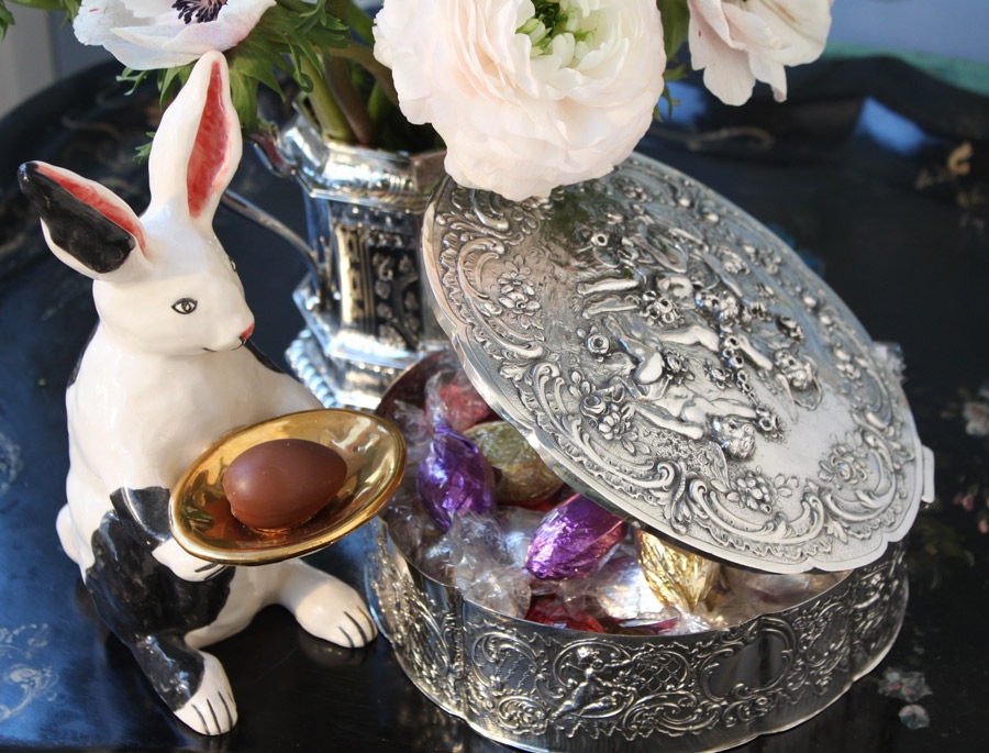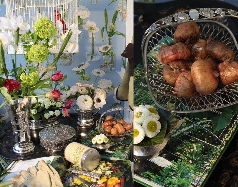 Der Garten ruft! Jede freie Minute verbringe ich jetzt hier – es gibt viel zu tun. Aber auch wenn das zeitige Frühjahr ideal für die Arbeit im Garten ist, zum draußen sitzen oder gar frühstücken ist es oft einfach noch zu kühl. Die richtige Zeit für unsere kleine Loggia - nicht drinnen, nicht draußen – der ideale „Zwischenort“. Hier frühstücken wir oder trinken unseren Nachmittagstee und genießen den Blick in den Innenhof, der langsam aber sicher immer grüner wird. Hier sitze ich auch gerne bei schlechtem Wetter und plane mein Gartenjahr, wälze neue Gartenbücher und Pflanzenkataloge, bestelle Rosen aus England, ausgefallene Blumenzwiebeln und Samen für Kräuter und Gemüse beim Biogärtner aus Tirol. Dann schmücke ich die Loggia mit vielen duftenden Frühjahrsblühern, teils sogar schon aus dem eigenen Garten und arrangiere sie in allerlei Silbergefäßen, die dafür auch schon mal zweckentfremdet werden. Prunkstück ist die große, hohe Jugendstilvase, die auch ohne Schneebällchen, Schwertlilien und bizarren Papageientulpen ganz prachtvoll aussieht. Die Jardiniere ist mit Primeln bepflanzt, die Londoner Zuckerschale von 1844 mit ihren wunderschönen ziselierten Chinoiserien dient zur Zeit als Vase für zarte Ranunkeln und Anemonen. Der kleine Biedermeierkorb ist mit Zwiebeln einer neu gezüchteten Lilienart bestückt, in der kleinen russischen Schale, die einen Rand mit vergoldeten petitfleurs hat, stehen die ersten Garten-Gänseblümchen dieses Jahres. Die große, runde Dose aus Hanau um 1890, auf der fröhliche Putten mit Blumenranken für Frühlingsgefühle sorgen, ist jetzt Sammelort für meine neuesten Samenraritäten, obwohl sie, ganz ehrlich - gefüllt mit bunten Schokoladeneiern - viel besser als kostbare Osterüberraschung zur Geltung kommen würde.