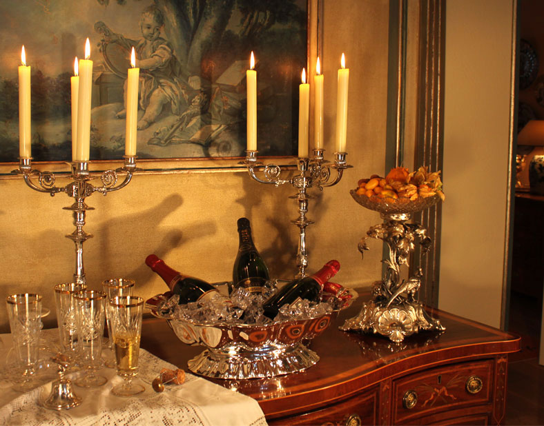 Spätestens aber bis Mitte Januar holen wir das Versäumte nach und laden Freunde zum Neujahrsempfang um jetzt gemeinsam mit ihnen das neue Jahr willkommen zu heißen- mit besten Vorsätzen, neuen Plänen und viel schönem Silber. Das Neujahrsbüffet mit Lachstartar bis Rollmops ist diesmal nordisch zünftig, die Champagner-Bar auf dem Sideboard edel und luxuriös. Der Champagner bekommt in der großen Art Deco Silberschale eine stilvolle Kühlung. Drei bis vier Flaschen und jede Menge Eis passen in so eine „Silberwanne“, die aber auch im „Alltag“ als noble Obstschale oder elegante Jardiniere auf jedem großen Tisch ein absoluter Eyecatcher ist. Das gilt ebenso für das hohe Paar Girandolen aus Leipzig um 1800, das mit jeweils vier Kerzen für stimmungsvolles Ambiente sorgt. Aus Frankfurt um 1840 stammt der prächtige Tafelaufsatz, in dessen schön geschliffener Kristallschale exotische Früchte als Zierde und zum Dessert arrangiert sind. Der Tafelaufsatz im Louis Philippe Stil, aus dem Hause Hessenberg, eine der führenden Silberschmieden Frankfurts im 19. Jahrhundert, ist höchst aufwändig mit Attributen von Wasser und Land gestaltet: Ente und Fasan, Muscheln und Blumen, Schilf und Lilienblüten. Vielleicht ist Ihnen aufgefallen, wie unbekümmert wir, hier und auch schon in vorherigen Kalenderbildern, das Silber verschiedener Stile und Epochen – hier sind es Art Deco, Empire und 2. Rokoko - miteinander in und zu einem Bild mischen. Mit ein wenig Geschick können Sie (fast) alles kombinieren.