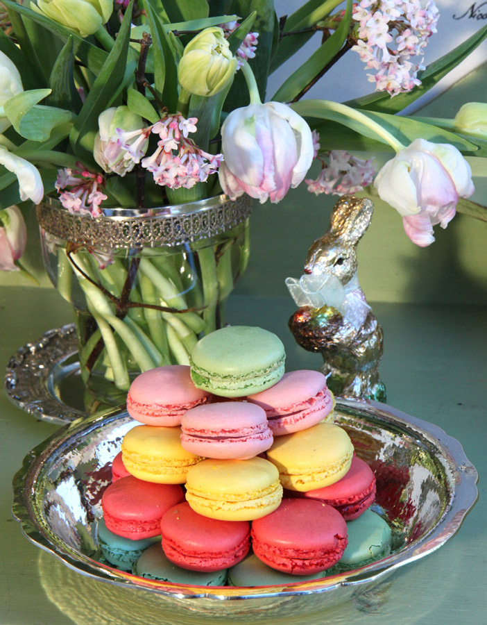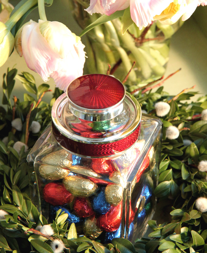 Ostern war nach Weihnachten ganz sicher das Lieblingsfest meiner Kindertage. Am Ostersonntag weckte uns unsere Großmutter mit einem Apfel, den wir, ohne vorher ein Wort sprechen zu dürfen, aßen – ein alter Osterbrauch aus Großmutters Heimat, der langes Leben und ewige Schönheit bringen sollte. Dann aber ging´s mit Juche aus dem Bett, um in Haus und Garten zu suchen, was der Osterhase gebracht hatte. Nun, die vielen Leckereien, bunten Eier und kleinen Geschenke hatte natürlich meine Mutter versteckt, teilweise so raffiniert, dass noch im Sommer per Zufall das eine oder andere zum Vorschein kam. Zum Osterbrunch war der Tisch festlich mit viel Silber und noch mehr bunten Tulpen gedeckt, es kamen Verwandte und Freunde und es wurde bis zum späten Nachmittag gegessen, geredet und gelacht. Am Abend hatten alle Kinder Bauchweh von zu viel Schokolade und Zuckerzeug, waren aber trotzdem rundum glücklich. Auch heute noch freue ich mich ganz besonders auf Ostern. Ich esse noch immer morgens schweigend meinen Apfel, decke für Familie und Freunde den Tisch mit viel „Farbe" und Silber für den Osterbrunch und – will auf alle Fälle ein „Osterei" suchen. Was für eine Freude wenn der Osterhase anstatt Süßem, Silber versteckt hat. (Geht natürlich auch in Kombination) Wir haben in der Gartenloggia, in der wir wettersicher - halb draußen, halb drinnen - unseren Osterbrunch-Tisch für unsere Gäste decken, auf der alten Kommode ein paar glänzende Ideen für den Osterhasen zusammengestellt: Als Centerpiece im wahrsten Sinne des Wortes, steht die prächtig verzierte Fußschale aus Wien um 1870, die kunterbunten und sehr leckeren Maccarones werden in der runden Art Deco Schale aufgeschichtet, eine feine Handarbeit aus dem Haus Carl Weißhaupt, der berühmten Silberdynastie aus München. Hier besonders dekorativ mit einer Glashaube vor kleinen, allzu vernaschten Kinderhänden geschützt. Davor sitzt vergnügt ein Osterhase in der Sahnekanne aus Stuttgart um 1830, daneben prall gefüllt eine polnische Deckeldose aus Warschau der Dreißiger Jahre und die Kristalldose mit schwerem Silberdeckel aus Wien um 1920. Fast wie ein Osterei selbst wirkt die mit Schokoladeneiern farbig bestückte