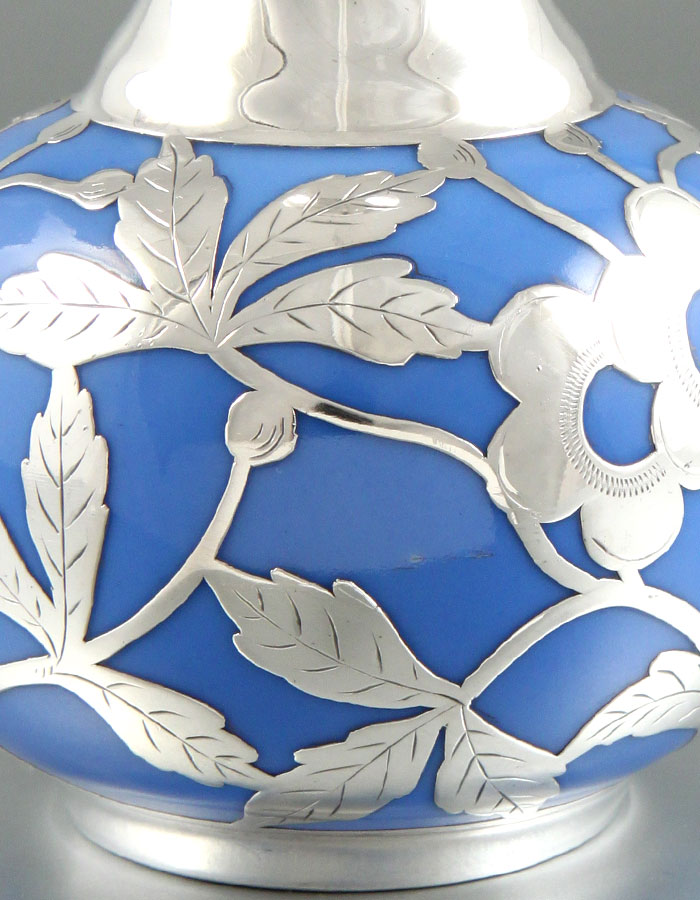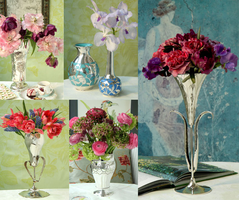 Frische Blumen gehören ins Haus! Sie bereichern das Leben, erhellen unseren Alltag, betören uns mit Farbe und Duft, verschönern Räume und schmücken jeden gedeckten Tisch - wir lieben sie! Jede Blume ist ein kleines Kunstwerk für sich, fantasievoll arrangiert im „richtigen" Gefäß wird daraus ein Gesamtkunstwerk. Das gilt für ein prachtvolles Rosenbouquet ebenso, wie für die einzelne Orchidee oder den bunten Wiesenstrauß. Zu allen Zeiten – damals wie heute- haben sich Künstler und Designer mit dem Thema Blumengefäße beschäftigt und unterschiedlich Wunderbares kreiert: Denken Sie an die Blumen geschmückten Tafelaufsätze königlicher Feste, die einmaligen Glasobjekte der Jugendstilzeit von Gallé oder Lalique oder an Modernes und manchmal auch Kurioses junger Designer aus den USA oder Japan. Aber auch eine nostalgische Kaffeekanne, eine originelle Blechdose oder ein Moos bewachsener Tontopf können für ein einmaliges Blumen- Arrangement sorgen. Die edelste Variante jedoch, Blumen in Scene zu setzten, ist Silber. Die Blumen selbst in Ihrer großen Vielfalt, dienten den Silberschmieden als schier unerschöpfliche Quelle der Inspiration. Was daraus geschaffen wurde, davon zeigen wir Ihnen hier ein paar besonders schöne Beispiele: Gleichsam als Blume wurden zwei dieser Vasen geformt und gestaltet. Links eine "Tulpe", deren feingezeichnete Blüte als Kelch für den Strauß dient. Die Tulpenblätter sind ebenfalls naturalistisch gearbeitet und zeigen einen Rest von Vergoldung. Geerdet wird der Blütenstengel der Tulpe auf einem breiten Standteller. Ganz ähnlich und ebenso kunstvoll gearbeitet ist die Vase rechts im großen Bild in Gestalt einer Lilie. Beide Blumenkelchvasen stammen aus der Jugendstilzeit, in der wohl die schönsten und ausdrucksvollsten Silberblumen (und das nicht nur für Vasen), gefertigt wurden. Eindrucksvoll wird dies auch bei der großen Jugendstilvase deutlich, die aus der Münchner Werkstatt von Eduard Wollenweber kommt – schon für sich allein ein „blühendes" Prachtstück. Um einiges schlichter präsentiert sich die Kopenhagener Vase von 1917, die in ihrer strengen Pokalform und den stilisierten Blüten bereits zu den Objekten des angehenden Art Déco zählt. Bei den Silbervasen nehmen die Vasen mit Silber-Overlay eine bemerkenswerte Ausnahmestellung ein. Unter Silber-Overlay versteht man die elektroplattierte Beschichtung aus Silber auf einer nicht leitenden Oberfläche, wie zum Beispiel Porzellan oder Glas. Als Erfinder gilt Friedrich Deusch aus Pforzheim, der Ende des 19. Jahrhunderts mit dieser Technik experimentierte und 1913 auf der Weltausstellung in Gent dafür eine Goldmedaille erhielt. Neben der Firma Deusch & Co., war es Friedrich Wilhelm Spahr, der mit seiner 1937 in Schwäbisch Gmünd gegründeten Firma, dieser Silbertechnik zu Bekanntheit und Ruhm verhalf. Vor allem die frühen Arbeiten von Spahr, zu denen auch unsere beiden Vasen aus blauem und türkisfarbenem Porzellan gehören zeigen seine ganz eigene Formensprache im Art Déco: Komplett umlaufende und sich wiederholende Motive aus stilisierten floralen Elementen. Als spezielle Besonderheit, wurde die Silberauflage zusätzlich feinst graviert. Die frühen Arbeiten von Spahr sind mit der Silberpunze „Spahr 1000 10" gekennzeichnet. In unserem Artikel „Overlay- Silber auf Porzellan und Glas" im Magazin, finden Sie, wenn Sie mögen, ausführliche Informationen zur Geschichte und Technik des Silber-Overlays.