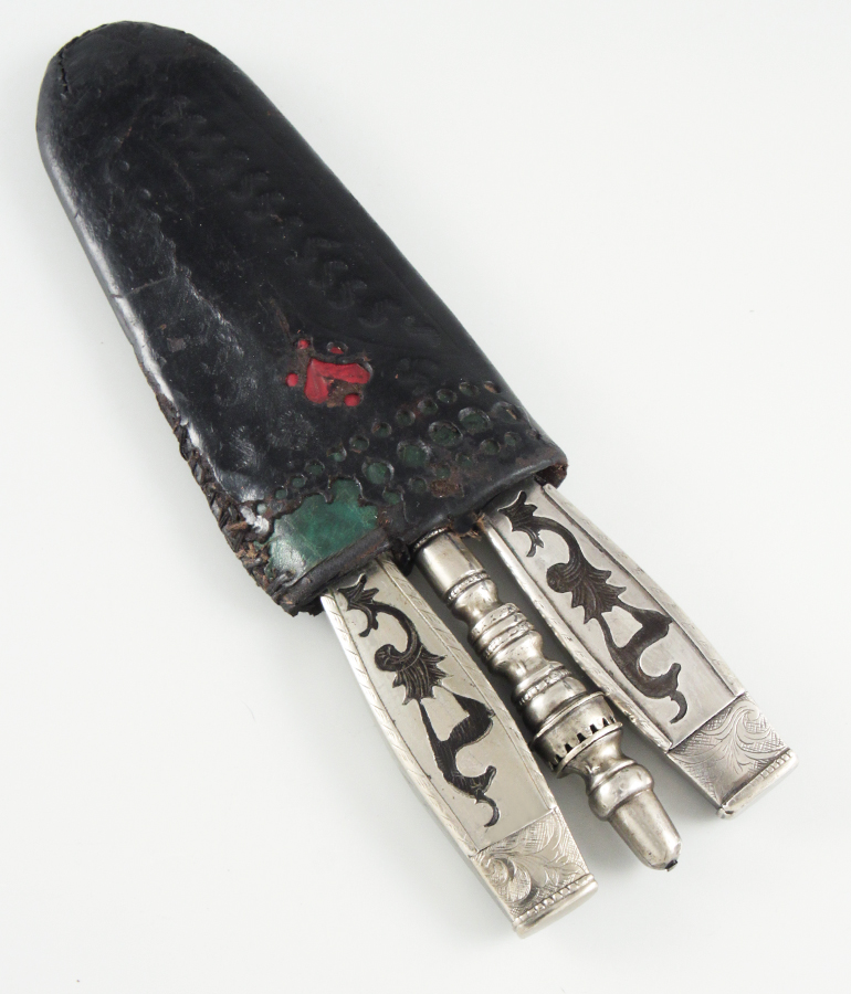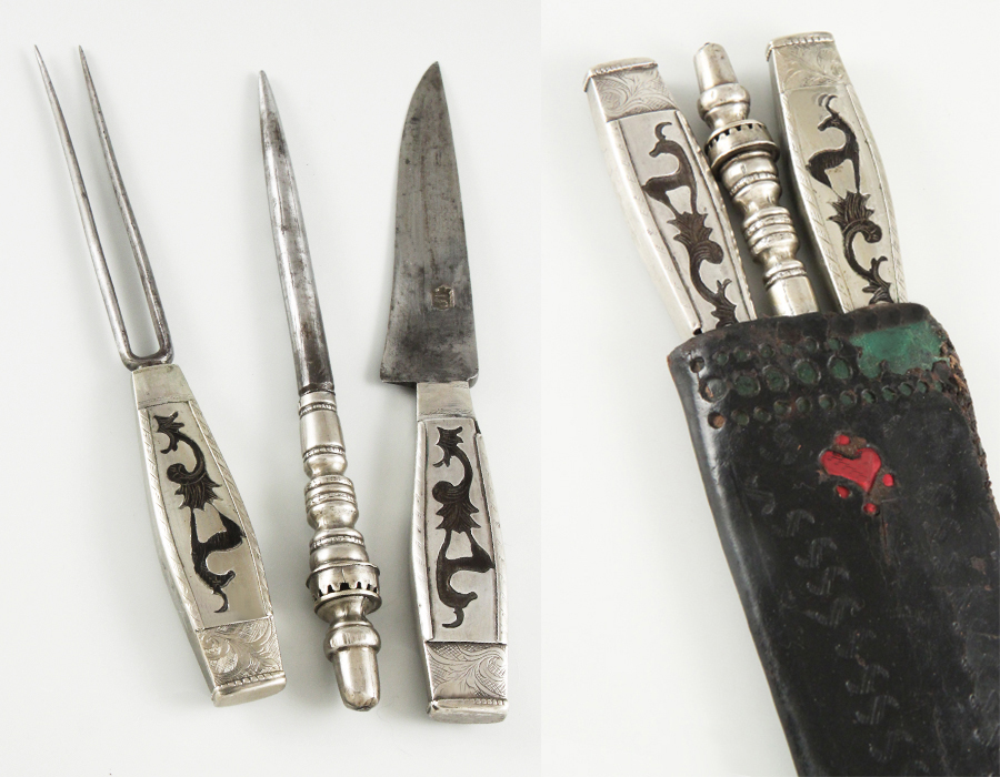 Messer, Gabel, Wetzstahl, Lederetui, Horn, Silber, Stahl,