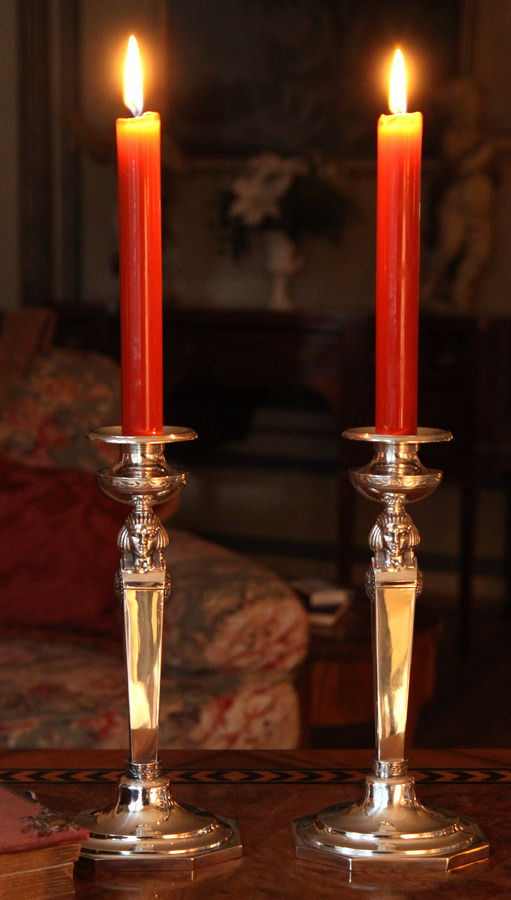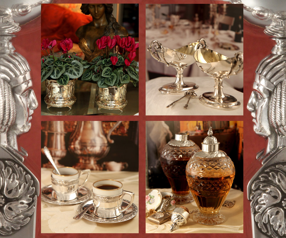 „Ein schönes Paar!" – sagt man und meint: Hier passen Zwei ganz wunderbar zusammen. Dieses perfekte Doppel finden wir immer wieder auch beim Silber: Als zwei sich gleichende Stücke, sich ergänzende oder bedingende Teile, als Pärchen, als Pendant – oder einfach auch nur, weil zwei Menschen zwei gleiche Exemplare wollen oder brauchen. Fangen wir mit den Leuchter-Paaren an. Hier im Bild Close-up und "Lifebild" von einem Paar Empireleuchter aus Nürnberg um 1820 mit ägyptischen Doppelköpfen. Wichtigster Bestandteil klassischer Einrichtungen, allen voran in England, ist die Symmetrie, die Anordnung von (Kunst-)Gegenständen links und rechts um einen Mittelpunkt. So geben Leuchter-Paare nicht nur langen Esstischen Format, sondern entsprechen auch auf Kaminsimsen, Anrichten und Kommoden um ein Tablett, eine Skulptur oder ein Bild gruppiert, dem Gedanken der Symmetrie aufs Schönste. Dies gilt auch für unsere Pariser Cachepots aus der Jugendstilzeit. Die beiden, zehn Zentimeter hohen, vergoldeten Übertöpfe geben aber auch direkt neben einander gestellt auf einem Tisch oder einer Fensterbank ein entzückendes Bild. Zwei Einsätze aus vergoldetem Messing schützen die Silbertöpfe vor „Wasserschäden". Auf einer großen Tafel, gehören neben dem Paar Leuchter, eigentlich schöner und praktischer Weise ein Paar Salieren (können bei vielen Gästen auch gerne mehr sein), hier ein Paar aus Wien 1825 in klassischer Schiffchenform von dem berühmten Wiener Silberschmied Christian Sander senior. Für das Heute wieder gerne verwendete Fleur de Sel, dass es in mittlerweile in vielen verschiedenen Geschmacks- und damit auch Farbvarianten gibt, haben so ein Salierendoppel einen dekorativer Vorteil. Ein Glasflakon mit Silber aus dem 18. Jahrhundert, unversehrt und in bester Erhaltung ist selten und kostbar, das Paar davon in gleicher Qualität um ein Vielfaches. Wir haben so ein besonderes Paar gefunden. Die großen Kristallflakons mit Steinelschliff wurden in Nürnberg 1767/69 von dem Silberschmied Johann Michael Drechsel mit aufwändigen Silbermanschetten und fein gestalteten Silberstöpseln versehen. Wir sind stolz auf dieses einmalige Paar!