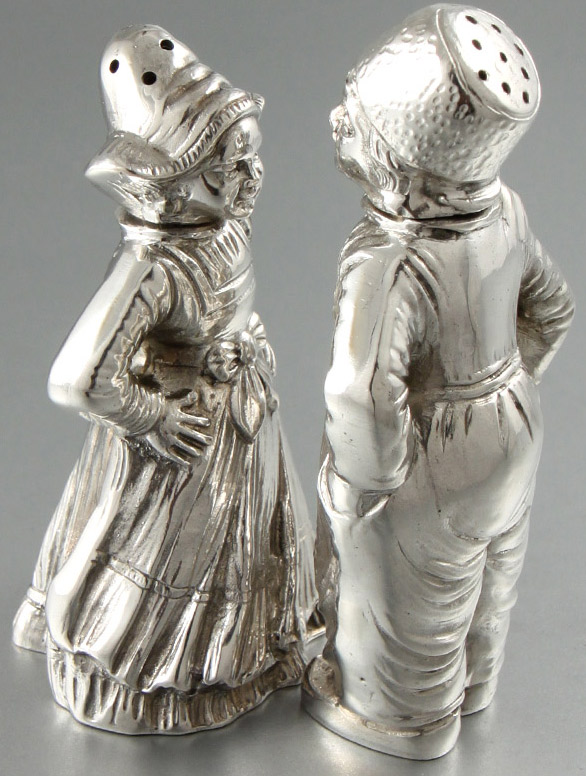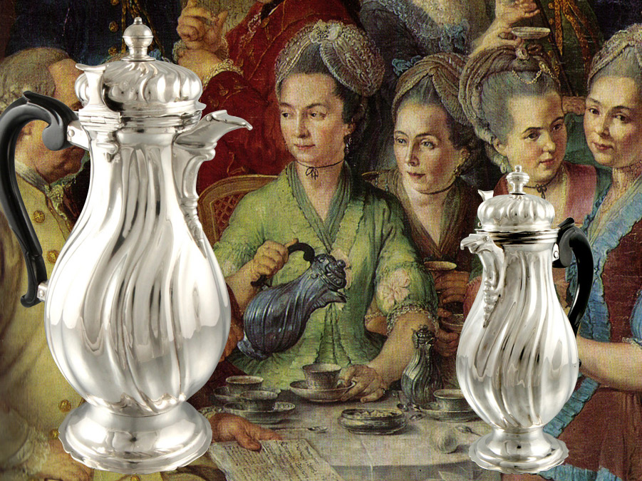 Zur gleichen Zeit, in den Jahren 1769/73 entstanden in Augsburg die prächtigen Rokokokannen von dem Meister Jakob Wilhelm Kolb, der neben Johann Georg Kloss, der wohl berühmteste Augsburger Kannenmacher seiner Zeit war. Sie zeigen die bekannte Augsburger Kannenform, die in der Barockzeit ab circa 1730 zu finden ist: Birnenförmig und fassoniert auf einem Standring. Der Ausguss ist kurz und hoch angesstzt und mit einem Deckelchen verschlossen, der haubenförmige Scharnierdeckel ist seitlich angebracht und ist mit einem Heber versehen, der elegante Volutenhenkel wurde aus Ebenholz geschnitzt. Die Züge der Augsburger Barockkannen in der 1. Hälfte des 18. Jahrhundert sind gerade (Sie erinnern sich vielleicht an den Artikel zu unseren barocken Augsburger Teekannen vom letzten Mal) und werden dann im Übergang zur Rokokozeit in der 2. Hälfte des 18. Jahrhunderts, wie hier zu sehen, schwungvoll gedreht. Das Gemälde von Januarius Zick von 1776 „Bildnis der Familie Remy in Bendorf" zeigt die Familie mit Gästen an der Kaffeetafel mit ebensolchen Kannen. Die große Kanne für den Kaffee, konnte Mittels des abschraubbaren Deckelknaufes zur Schokoladenkanne werden. Im Loch des Deckels steckte dann der obligatorische Schokolandenquirl. Die dazugehörige kleine Kanne war damals immer eine Heißmilchkanne. Auch hier ist das Besondere das Paar. Im Laufe der Zeit wurden diese Paare oft auseinandergerissen oder es ging ein Part kaputt oder verloren. Später tauchte im Antiquitätenhandel hier mal die Kaffeekanne dort die Milchkanne auf, die meist einzeln als Mokkakanne angeboten wurde/wird. Nur noch selten trifft man, wie jetzt in der Silbersuite, auf das zusammengehörige Doppel. Ein Pärchen ganz anderer Art und im wahrsten Sinne des Wortes ein echtes Paar, sind die Streuer aus Belgien um 1890. Mädchen und Junge, „gekleidet" in der typischer Tracht aus Flandern, die Köpfe sind abnehmbar und aus Haube und Mütze rieselt Salz und Pfeffer - entzückend, selten und als Paar gesucht. Die Silbertassen waren zu Ihrer Produktionszeit um 1930 sicherlich nicht nur zu Zweit. Nun, anscheinend haben nur diese hier als Paar „überlebt" und sind für zwei Mokka- oder wie man heute wohl besser sagt Espressogenießer, die auch hier nicht auf Silber verzichten möchten, das perfekte Doppel. Die beiden Mokkalöffel gehören selbstverständlich dazu. Hier und in unserem Warenangebot in „neu eingestellt" haben wir uns diesmal ganz auf „schöne Paare" konzentriert: So finden Sie hier zum Beispiel ein Art Deco Becherpaar aus Paris um 1930 von Jean Puiforcat, gleiches Aussehen, verschiedene Größen, genau so wie die beiden Whiskykännchen aus England, sogenannte Whisky Tots in zwei verschiedenen Maßen, ein Paar viktorianische Serviettenringe, die noch ohne Monogramm, gleich Eheringen in einer noblen Box liegen und bestimmt ein wunderbares Geschenk für den Partner und für Zwei, die es werden wollen, wären. Edel ist auch das Duett von Butter- und Käsemesser im Jugendstil und das Paar Rahmen fehlt natürlich auch nicht.