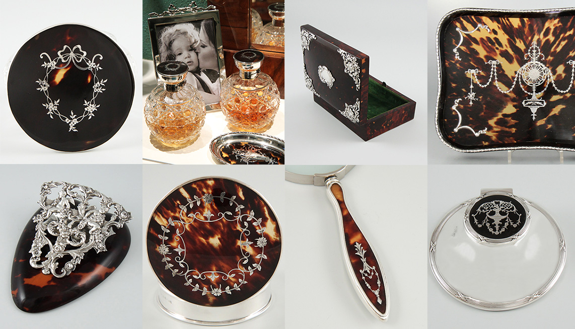 Schildpatt, das Wort stammt aus dem norddeutschen/niederländischen Wort für Schildkröte „Schildpadde" ab, gehört zu den ältesten Materialien, die von Menschen für Gebrauchs- wie Luxusgegenstände verwendet wurden. Die frühen Ureinwohnern der ozeanischen Inselwelten die Heimat der Wasserschildkröten, fertigten daraus ebenso Schmuck und Kultgegenstände, wie die Kunsthandwerker in den Hochkulturen der Ägypter und Römer. Im 16. und 17. Jahrhundert wurde durch die Entdeckung fremder Kontinente und dem daraus resultierenden Handel mit exotischen Gütern auch das Luxusmaterial Schildpatt in Europa bekannt und sehr begehrt. Hier begann auch seine „Partnerschaft" mit Silber und anderen kostbaren Materialien, wie Gold, Edelsteinen und Perlmutt. Kostbarkeiten dieser Art fand man im 16. bis 18. Jahrhundert vor allem in den Kunst- und Wunderkammern des europäischen Hochadels - heute noch zu bestaunen, zum Beispiel im Grünen Gewölbe in Dresden oder in der Residenz München. (Hier sei besonders der Prunkschreibtisch in Boulle-Technik – nach den weltberühmten Vorbildern des Hofebenisten Ludwig XIV., André Charles Boulle, 1642 bis 1732 - aus Antwerpen um 1700 und der Augsburger Kabinettschrank von 1680(85 erwähnt). Neben diesen „Kunstwundern" wurden aber auch schon damals luxuriöse Gebrauchsgegenstände in Schildpatt mit Silber gefertigt: Kämme, Haarspangen, Dosen, Schalen, etc. Ende 19. Anfang 20. Jahrhundert waren es die Engländer, die ein ganz besonderes Faible für die Kombination Silber und Schildpatt entwickelten. So wundert es nicht, dass berühmte Silberschmiede und renommierte Silbermanufakturen viele schöne und ausgefallene Gegenstände, besonders für den Toilettentisch und den Schreibtisch, mit dem nach wie vor sehr kostbaren Material herstellten. Aus dieser Zeit sind unsere gezeigten Objekte.